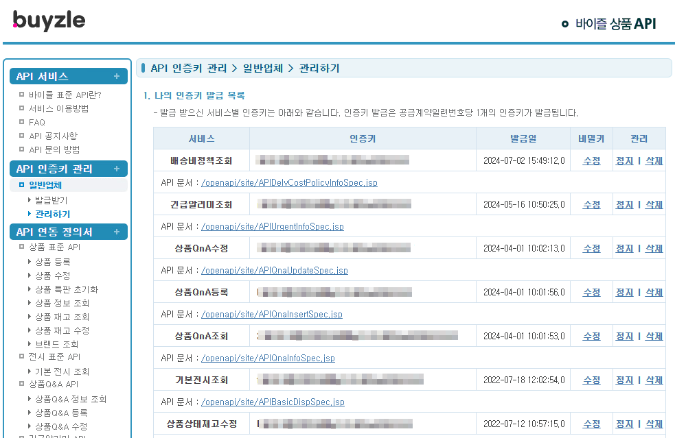 1. 신청 서비스 항목의 각각 인증키 및 비밀키 확인