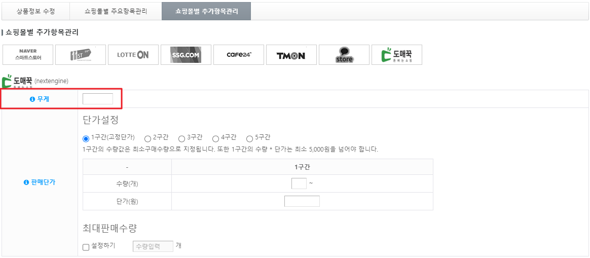 2. 쇼핑몰별 추가항목관리 > 도매꾹 > 무게 항목 입력 및 수정하기