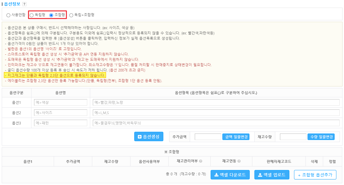 지그재그로 상품 등록송신 시 반드시 옵션을 '독립형' 또는 '조합형' 으로 설정해주셔야 합니다.