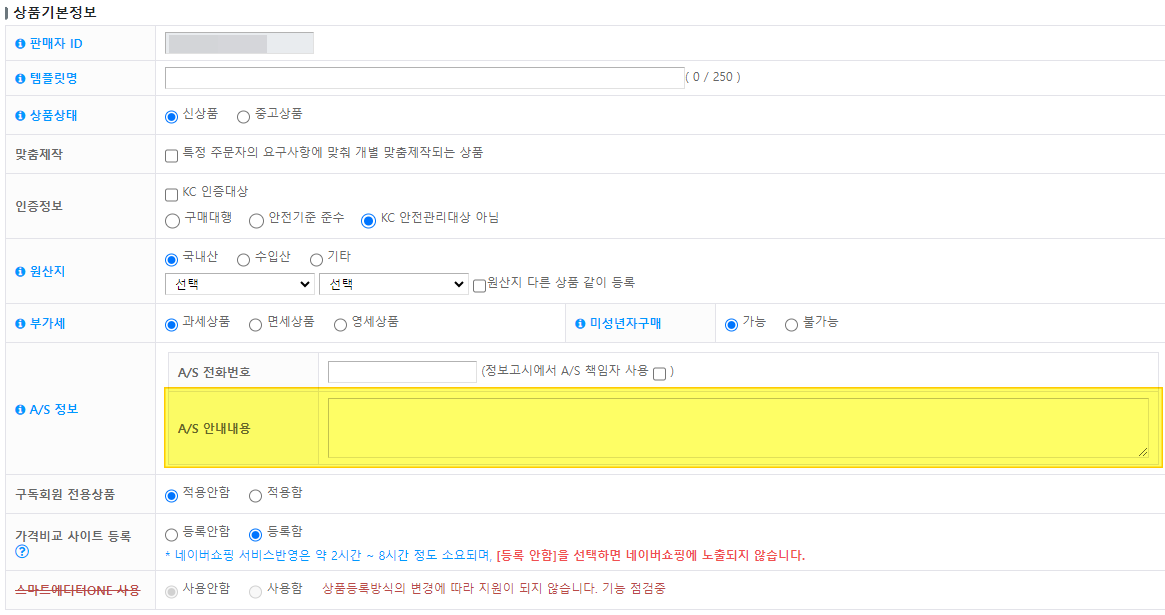 2. 스마트스토어 템플릿 > 상품기본정보 > A/S 정보 > A/S 문구 내 특수문자 삭제 > 수정하기