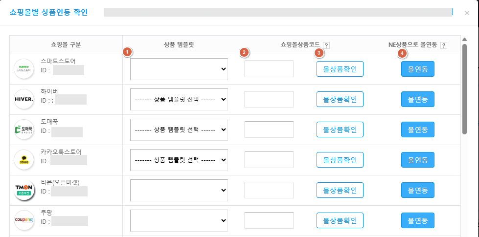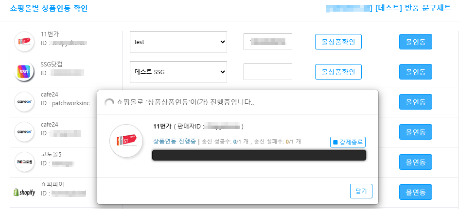 2) 몰연동 작업 시에는 [쇼핑몰별 상품연동 확인] 화면에서 아래의 버튼들을 순서대로 확인 및 클릭하여 진행합니다.