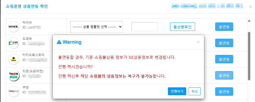 몰연동 작업 이후에는 연동 이전의 쇼핑몰 상품 정보로 복구가 어려우니 주의해 주시기 바랍니다.