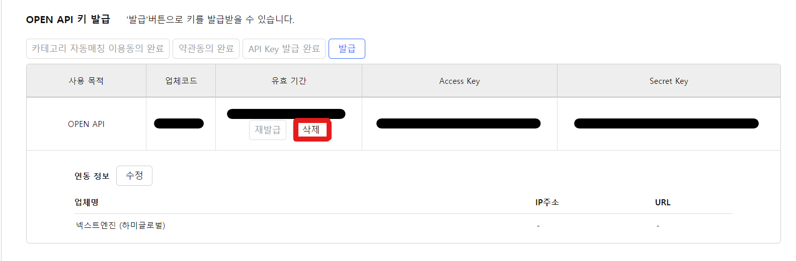 2. [OPEN API 키] 삭제 버튼을 클릭합니다.