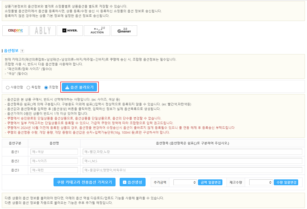 쿠팡은 전용 옵션 가져오기 기능을 지원하며, 추후 해당 기능은 다른 쇼핑몰로도 확대될 예정입니다.