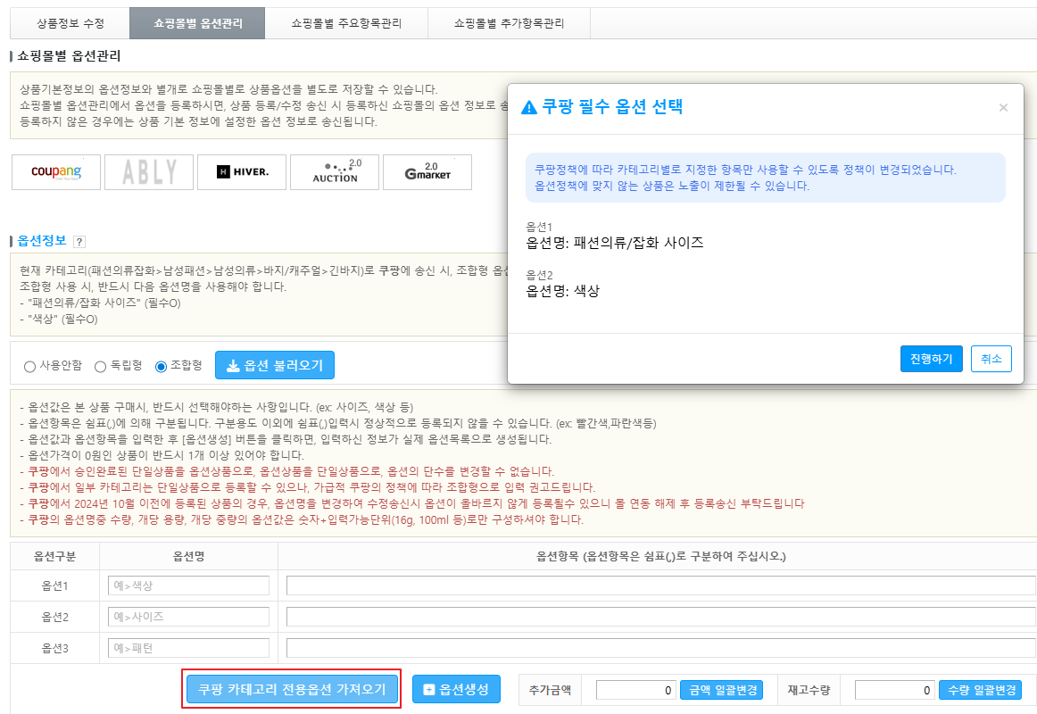 쿠팡 카테고리 전용 옵션 가져오기를 클릭하면, 설정된 카테고리 정보에 맞는 전용 옵션이 자동으로 옵션 정보에 적용됩니다.