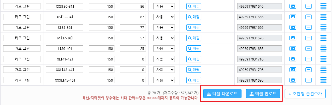 다른 상품의 옵션이 필요한 경우, 옵션 불러오기 또는 엑셀 다운로드/업로드 기능을 통해 가져올 수 있습니다.