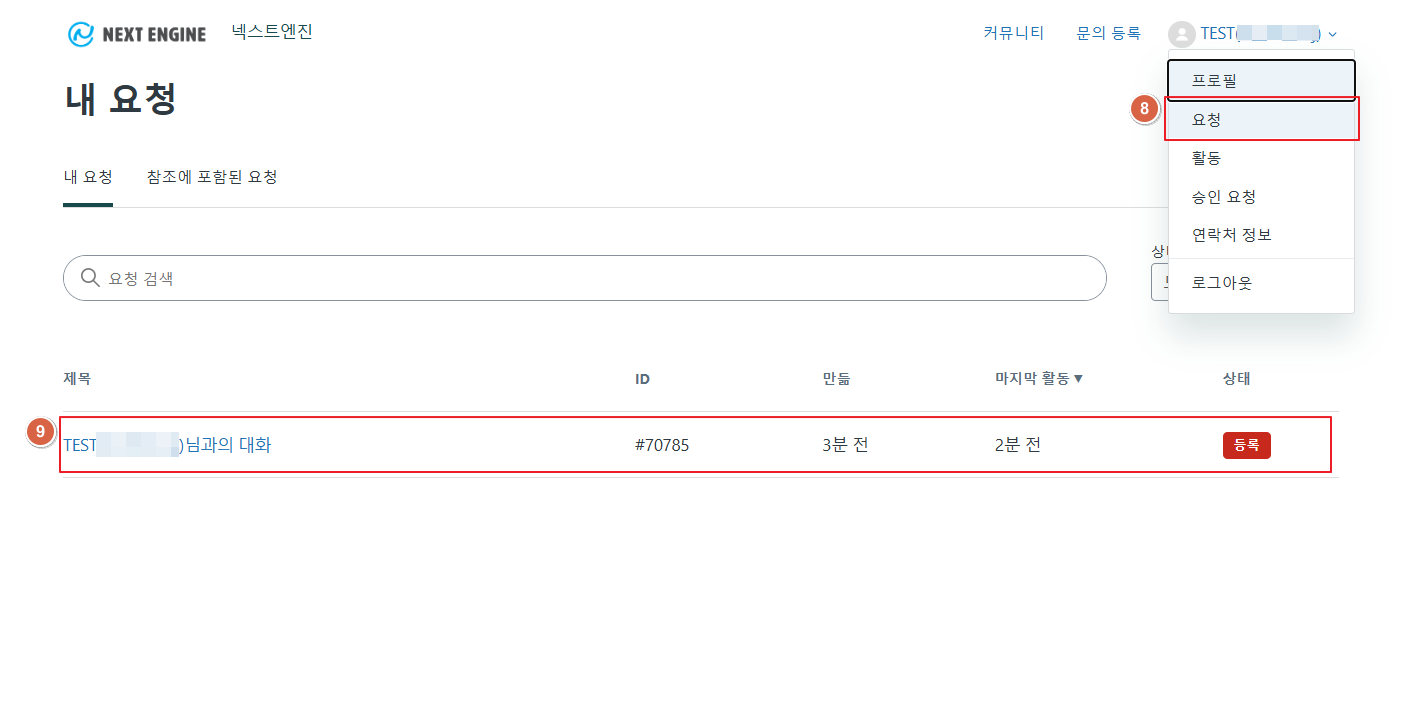 로그인 후 오른쪽 상단의 계정정보를 클릭하면 "요청" 항목을 확인할 수 있습니다.