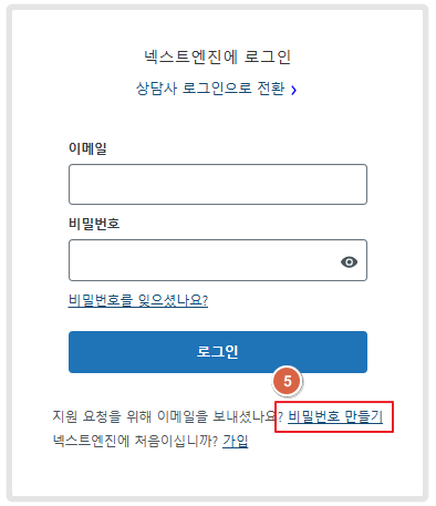 로그인 화면 하단의 "비밀번호 만들기" 버튼을 클릭합니다.