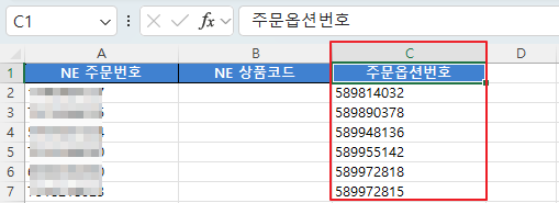 5. 다운로드한 엑셀 파일에서 "사용자1" 항목이 "주문옵션번호"로 표시됨을 확인할 수 있습니다.