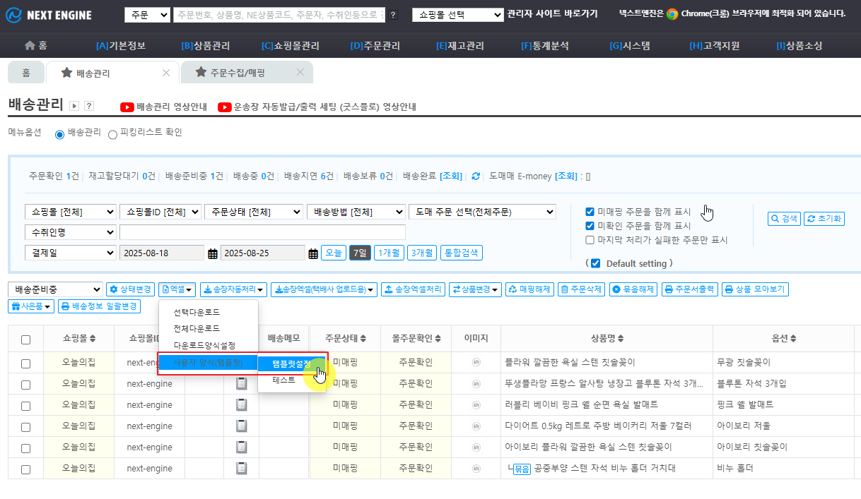 4. [D] 주문관리 > [3] 배송관리 > 엑셀 > 사용자 양식(템플릿)에서 저장된 템플릿을 확인합니다.