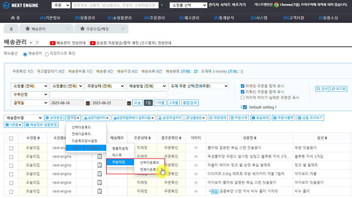 오늘의집은 넥스트엔진의 연동 쇼핑몰이 아니므로 기본 항목만으로는 다운로드가 불가능하며, 반드시 안내된 절차를 순서대로 진행해야 확인하실 수 있습니다.