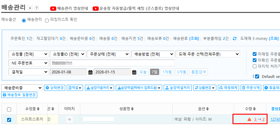 Q. [D] 주문관리 → [3] 배송관리에서 수량과 금액에 화살표로 표시된 건은 무엇인가요?
