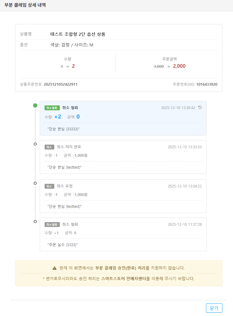 원 주문에서 부분 취소 처리 후 남은 수량 및 금액 현황을 표시하며, 해당 항목을 클릭하시면 부분 클레임 상세 내역에서 세부 내용을 확인하실 수 있습니다.
