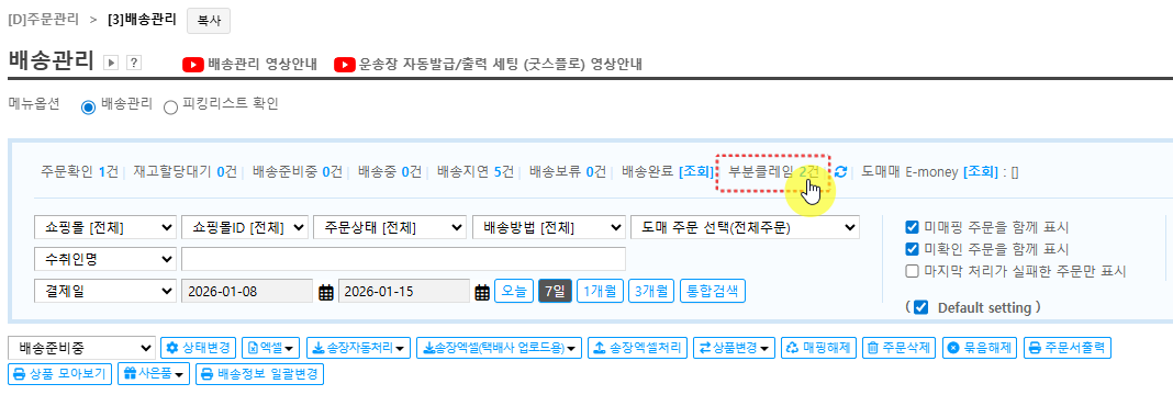 부분 취소 후에도 배송해야 할 수량이 남아 있는 경우이기 때문에 해당 주문은 ‘취소 완료’ 메뉴가 아닌 [D] 주문관리 → [3] 배송관리 메뉴에서만 확인할 수 있습니다.