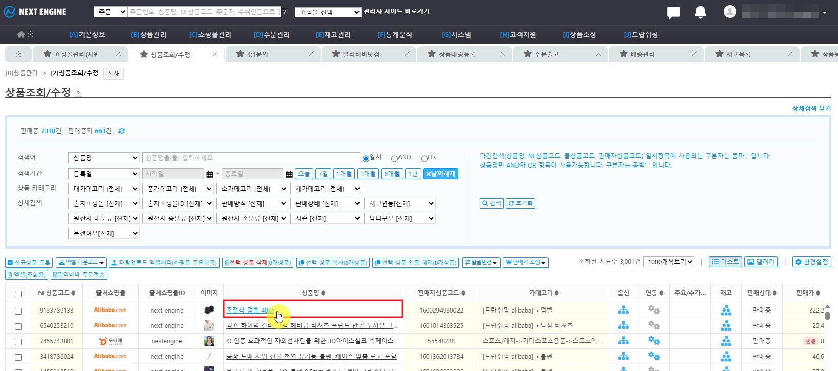 1. [B]상품관리 → [2]상품조회/수정 메뉴에서 수정할 상품의 “상품명”을 클릭하면 상품정보수정 페이지로 이동합니다.