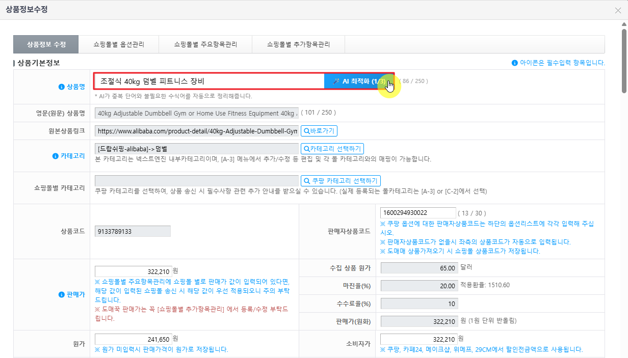 상품명 수정 시 AI 기능을 활용하여 번거로운 단어 정리 없이 간편하게 최적화해 변경할 수 있는 기능입니다.