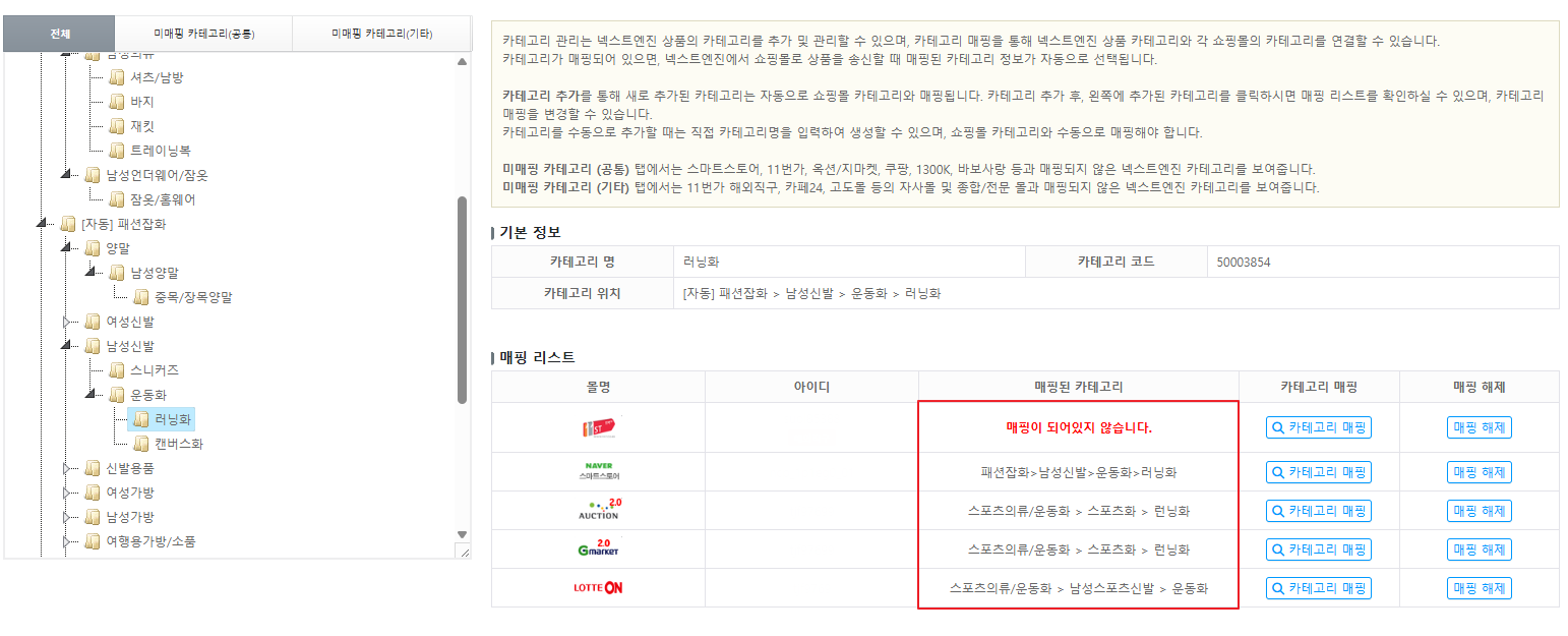 생성된 넥스트엔진 카테고리를 클릭하여 매핑 된 정보를 확인합니다.