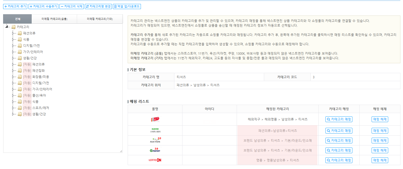 넥스트엔진에 직접 카테고리명을 입력하여 카테고리를 추가할 수 있습니다. 쇼핑몰 카테고리와 수동으로 매핑해야 합니다.