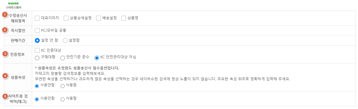 - 무관한 속성을 선택하거나 과도하게 많은 속성을 입력할 경우, 네이버쇼핑 검색에 정상적으로 노출되지 않을 수 있으니 주요한 속성을 중심으로 정확하게 설정해 주시기 바랍니다.