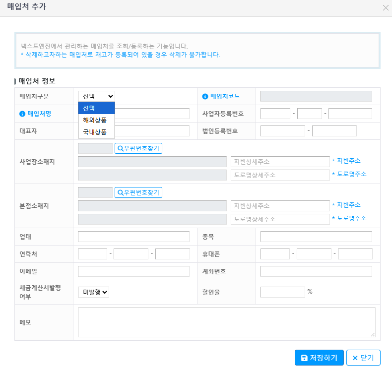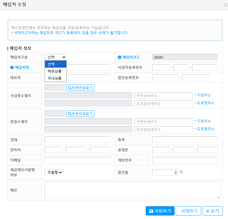 넥스트엔진을 통해 재고 관리를 하시고자 할 경우, 매입처 정보 등록은 필수입니다.