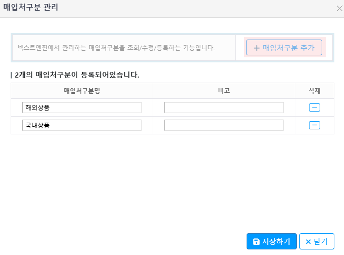 매입처구분 관리 기능을 통해 생성한 각 그룹에 대해 세부 정보를 입력할 수 있습니다.